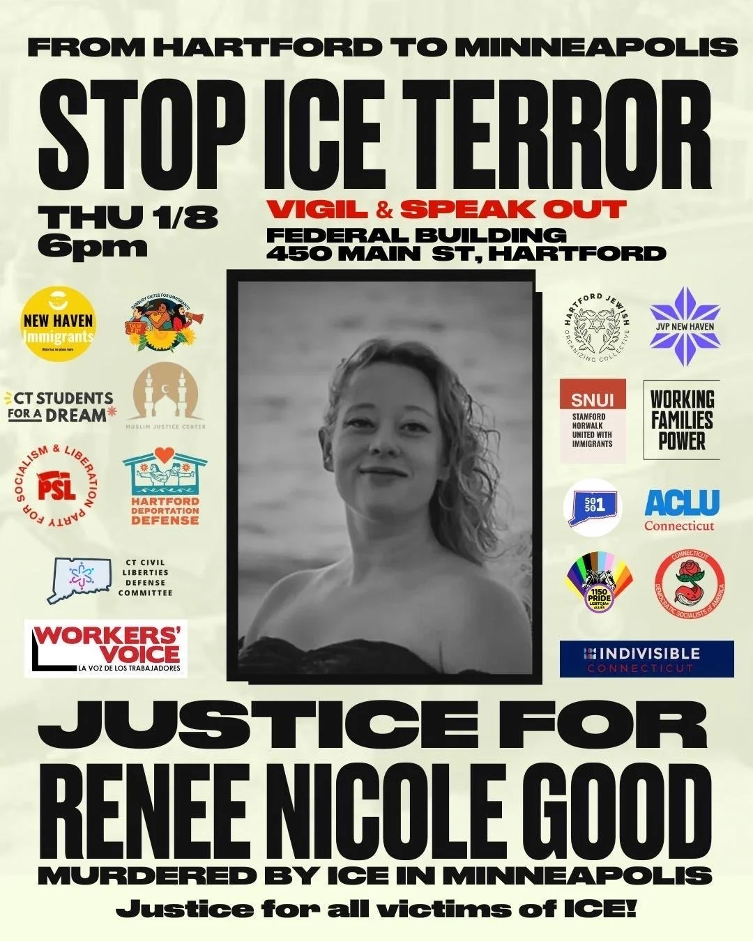 In response to the horrific killing, which rips away the mother of Renee’s young child, Connecticut activists held a statewide organizing call at 6PM Wednesday (1/7) to democratically and collectively plan a vigil and speak out honoring the life of Renee Good. That emergency planning meeting, which was shared by word of mouth and in organizing circles, quickly reached the 100 person limit imposed by Zoom. Workers, students, clergy, retirees, and organizers from all over the state committed to a vigil and speak out that will highlight the diverse support for immigrant and civil rights and opposition to ICE terror.